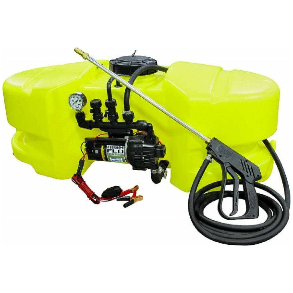 AG South gold series cap. 25 gallons Ideal for applying insecticides and herbicides. Dependable High-Flo pump with 3.8 GPM. Rugged pistol grip handgun for good solid performance. Applies spray right where user wants it. 96 inches lead wire with quick coupler, in-line switch and deluxe battery clip s allow operator to use sprayer immediately without hunting for wire and patching it to the power source. Includes: 15 feet of hose, handgun with adjustable tip, 25-gallon low-profile polyethylene tank with molded in recesses on tank ends for handles and/or hose storage. Tank has a 5 inches screw-on cap for easy filling, molded in gallon markers to view tank contents and molded in inserts on the bottom, which can be used to mount the tank in a variety of applications. Sprayer includes: 12-volt diaphragm pump that draws seven amps, has an output of 3.8 gallons per minute.